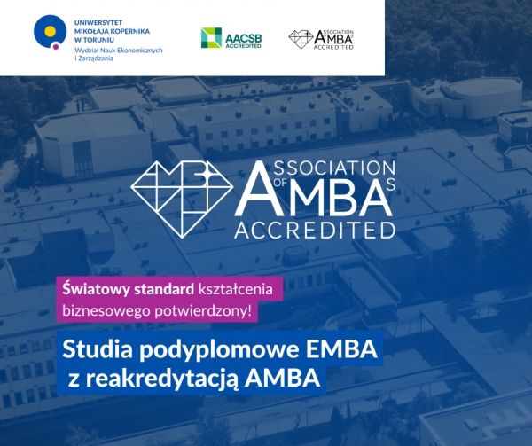 Studia Executive Master of Business Administration, realizowane na Wydziale Nauk Ekonomicznych i Zarządzania Uniwersytetu Mikołaja Kopernika w Toruniu, uzyskały międzynarodową reakredytację The Association of MBAs (AMBA). Organizacja ta należy do grona najważniejszych instytucji akredytujących programy kształcenia biznesowego na świecie.